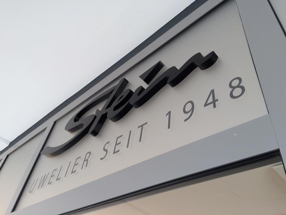 Logo Refresh. Layout und Montage von Milchglas und Acrylox Fräsbuchstaben. Juwelier Stein, Singen.